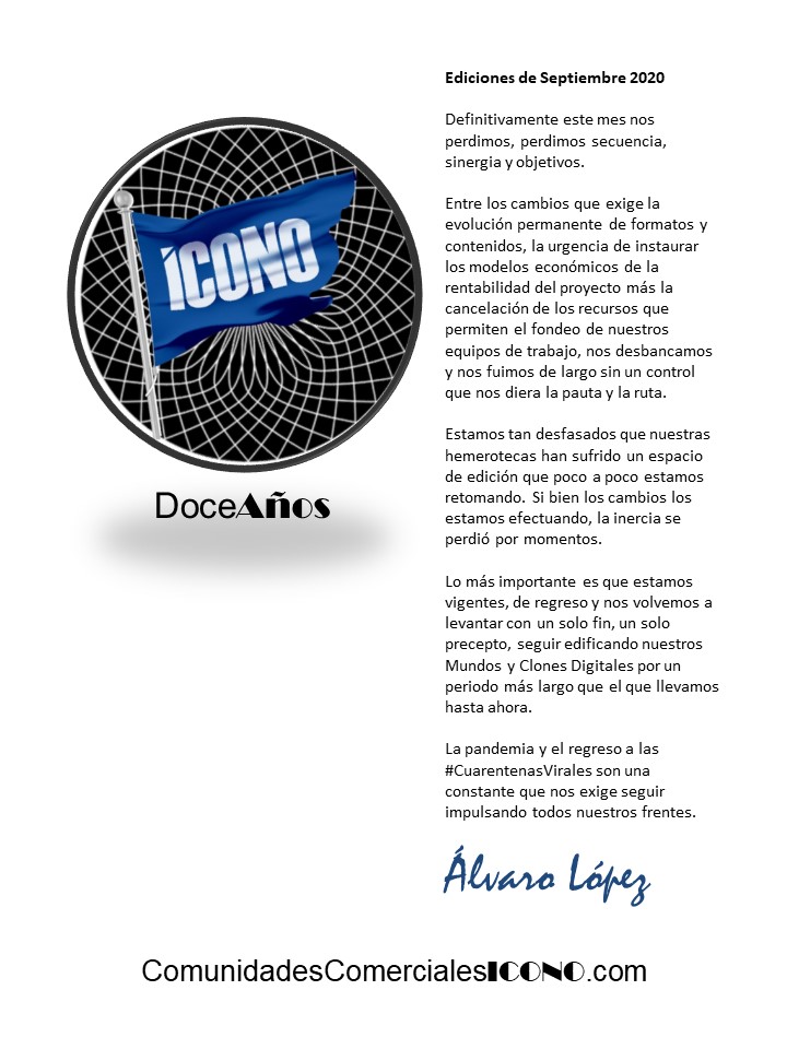 En ICONO Los medios pasan de informar a conectar, van más allá de las fronteras entrelazando sus contenidos con una fusión directa sobre sus audiencias. Hoy la evolución se concentra en temas de conectividad, de intercambio de información dinámicos, clicks, links, redes… todo en imágenes, multimedia de gadget y relaciones interpersonales que dejan atrás las reglas y fronteras tal y como se conocen en los últimos 20 siglos.