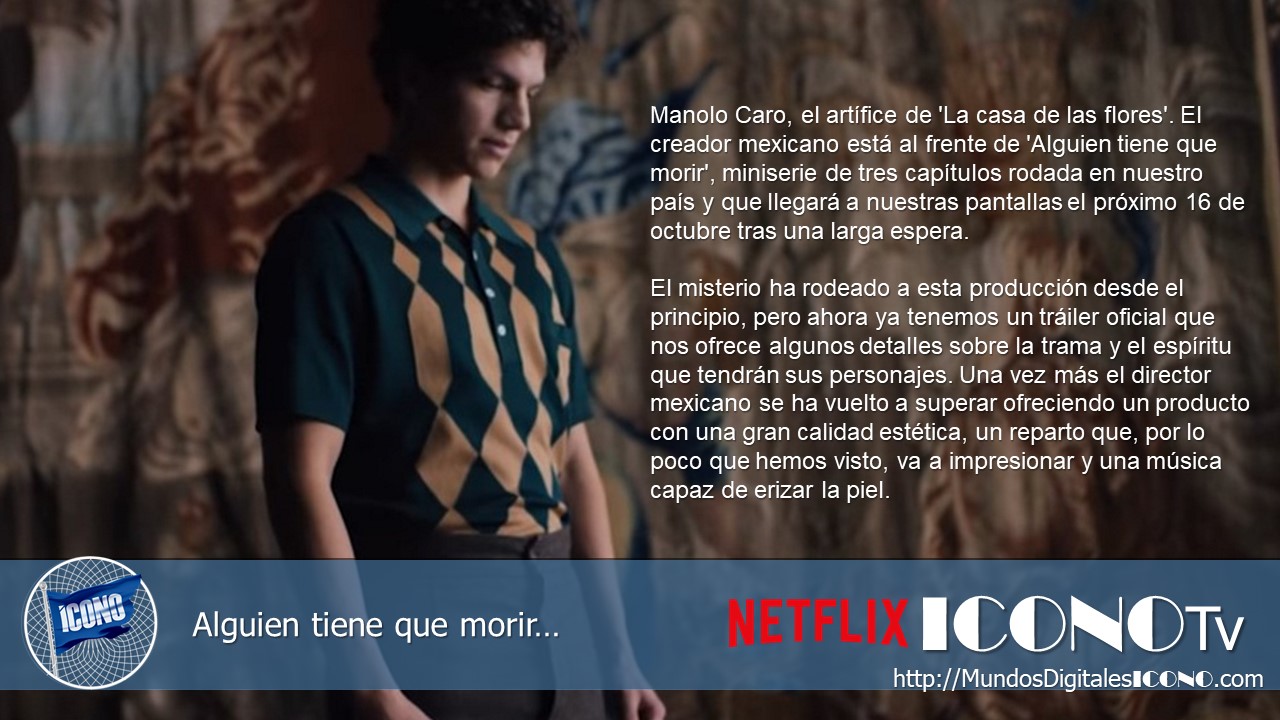 Netflix ha desvelado las primeras imágenes, el póster oficial y la fecha de estreno de Alguien tiene que morir, nuevo thriller creado y dirigido por #ManoloCaro (La casa de las flores), una miniserie que contará con 3 episodios y que se estrenará mundialmente el 16 de octubre.