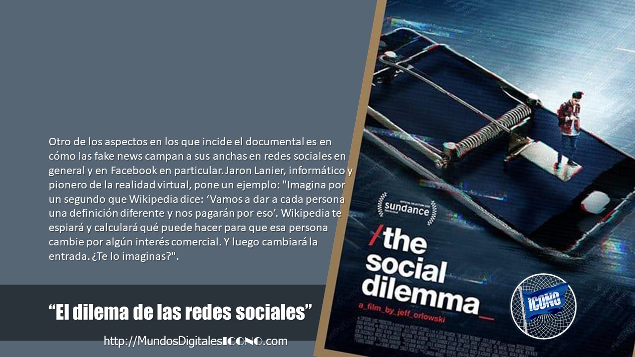 Otro de los aspectos en los que incide el documental es en cómo las fake news campan a sus anchas en redes sociales en general y en Facebook en particular. Jaron Lanier, informático y pionero de la realidad virtual, pone un ejemplo: «Imagina por un segundo que Wikipedia dice: ‘Vamos a dar a cada persona una definición diferente y nos pagarán por eso’. Wikipedia te espiará y calculará qué puede hacer para que esa persona cambie por algún interés comercial. Y luego cambiará la entrada. ¿Te lo imaginas?».