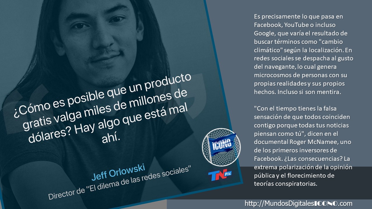 Es precisamente lo que pasa en Facebook, YouTube o incluso Google, que varía el resultado de buscar términos como «cambio climático» según la localización. En redes sociales se despacha al gusto del navegante, lo cual genera microcosmos de personas con su propias realidades y sus propios hechos. Incluso si son mentira. «Con el tiempo tienes la falsa sensación de que todos coinciden contigo porque todas tus noticias piensan como tú», dicen en el documental Roger McNamee, uno de los primeros inversores de Facebook. ¿Las consecuencias? La extrema polarización de la opinión pública y el florecimiento de teorías conspiratorias.
