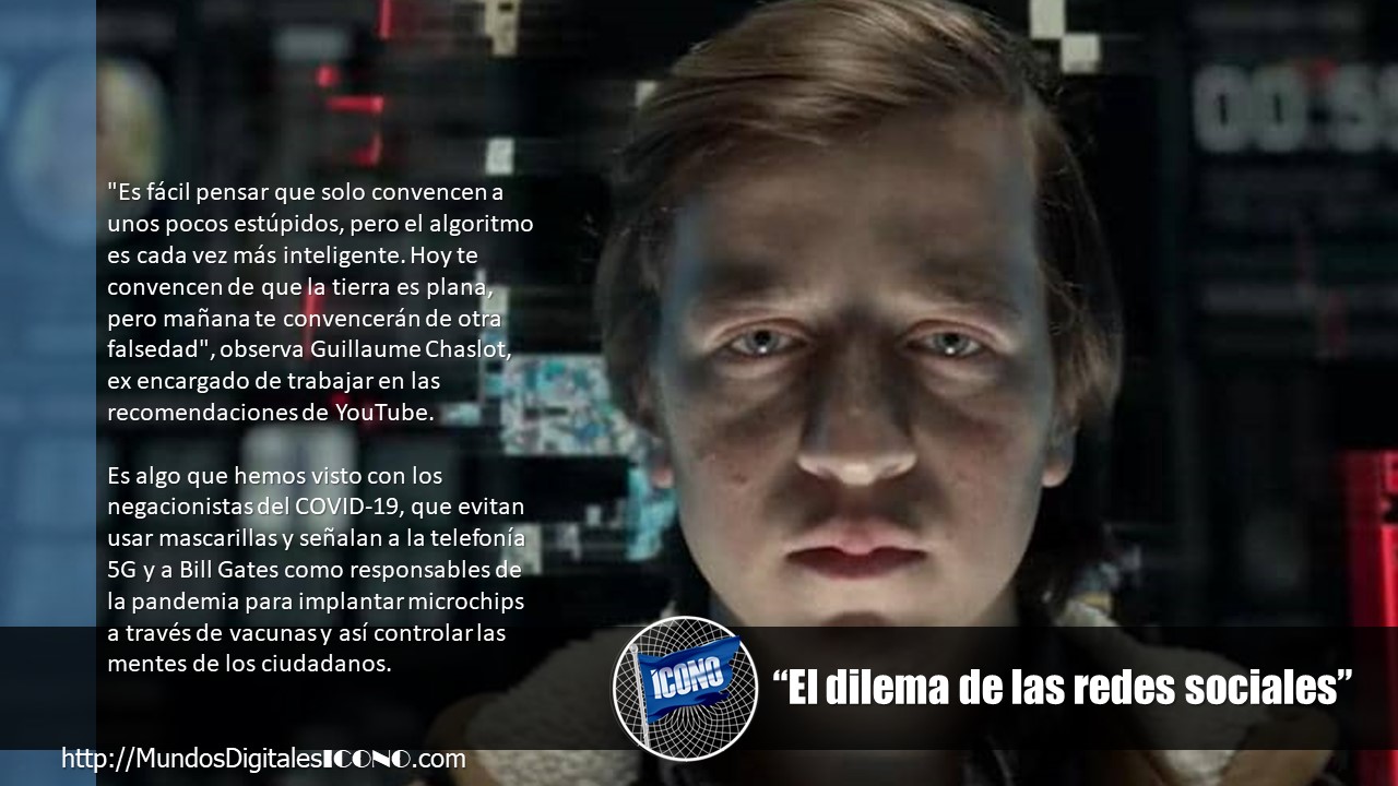 «Es fácil pensar que solo convencen a unos pocos estúpidos, pero el algoritmo es cada vez más inteligente. Hoy te convencen de que la tierra es plana, pero mañana te convencerán de otra falsedad», observa Guillaume Chaslot, ex encargado de trabajar en las recomendaciones de YouTube. Es algo que hemos visto con los negacionistas del COVID-19, que evitan usar mascarillas y señalan a la telefonía 5G y a Bill Gates como responsables de la pandemia para implantar microchips a través de vacunas y así controlar las mentes de los ciudadanos.