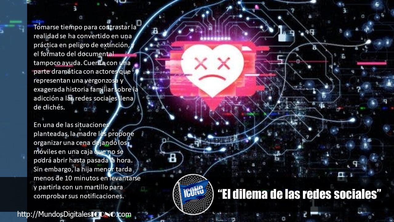 Tomarse tiempo para contrastar la realidad se ha convertido en una práctica en peligro de extinción, y el formato del documental tampoco ayuda. Cuenta con una parte dramática con actores que representan una vergonzosa y exagerada historia familiar sobre la adicción a las redes sociales llena de clichés. En una de las situaciones planteadas, la madre les propone organizar una cena dejando los móviles en una caja que no se podrá abrir hasta pasada la hora. Sin embargo, la hija menor tarda menos de 10 minutos en levantarse y partirla con un martillo para comprobar sus notificaciones.