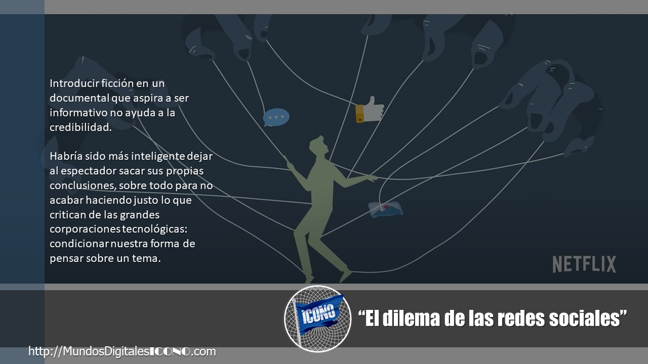 Introducir ficción en un documental que aspira a ser informativo no ayuda a la credibilidad. Habría sido más inteligente dejar al espectador sacar sus propias conclusiones, sobre todo para no acabar haciendo justo lo que critican de las grandes corporaciones tecnológicas: condicionar nuestra forma de pensar sobre un tema.