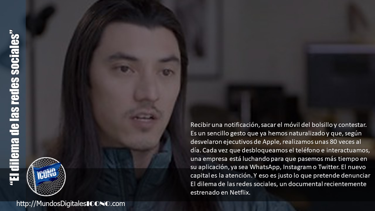 Recibir una notificación, sacar el móvil del bolsillo y contestar. Es un sencillo gesto que ya hemos naturalizado y que, según desvelaron ejecutivos de Apple, realizamos unas 80 veces al día. Cada vez que desbloqueamos el teléfono e interactuamos, una empresa está luchando para que pasemos más tiempo en su aplicación, ya sea WhatsApp, Instagram o Twitter. El nuevo capital es la atención. Y eso es justo lo que pretende denunciar El dilema de las redes sociales, un documental recientemente estrenado en Netflix.