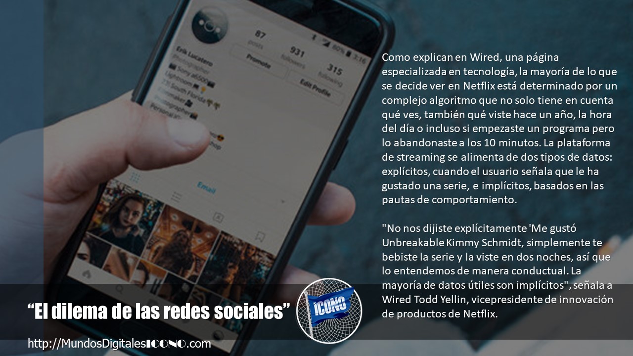 Como explican en Wired, una página especializada en tecnología, la mayoría de lo que se decide ver en Netflix está determinado por un complejo algoritmo que no solo tiene en cuenta qué ves, también qué viste hace un año, la hora del día o incluso si empezaste un programa pero lo abandonaste a los 10 minutos. La plataforma de streaming se alimenta de dos tipos de datos: explícitos, cuando el usuario señala que le ha gustado una serie, e implícitos, basados en las pautas de comportamiento. «No nos dijiste explícitamente ‘Me gustó Unbreakable Kimmy Schmidt, simplemente te bebiste la serie y la viste en dos noches, así que lo entendemos de manera conductual. La mayoría de datos útiles son implícitos», señala a Wired Todd Yellin, vicepresidente de innovación de productos de Netflix.
