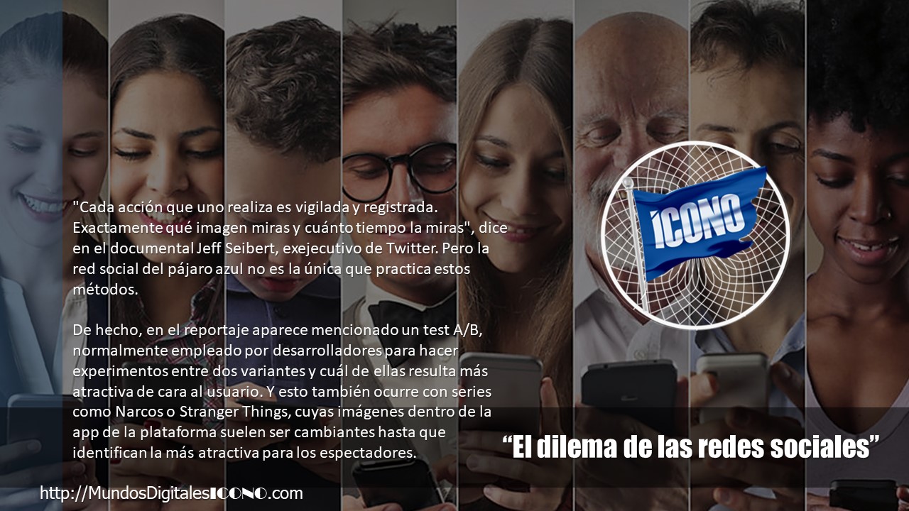 «Cada acción que uno realiza es vigilada y registrada. Exactamente qué imagen miras y cuánto tiempo la miras», dice en el documental Jeff Seibert, exejecutivo de Twitter. Pero la red social del pájaro azul no es la única que practica estos métodos. De hecho, en el reportaje aparece mencionado un test A/B, normalmente empleado por desarrolladores para hacer experimentos entre dos variantes y cuál de ellas resulta más atractiva de cara al usuario. Y esto también ocurre con series como Narcos o Stranger Things, cuyas imágenes dentro de la app de la plataforma suelen ser cambiantes hasta que identifican la más atractiva para los espectadores.