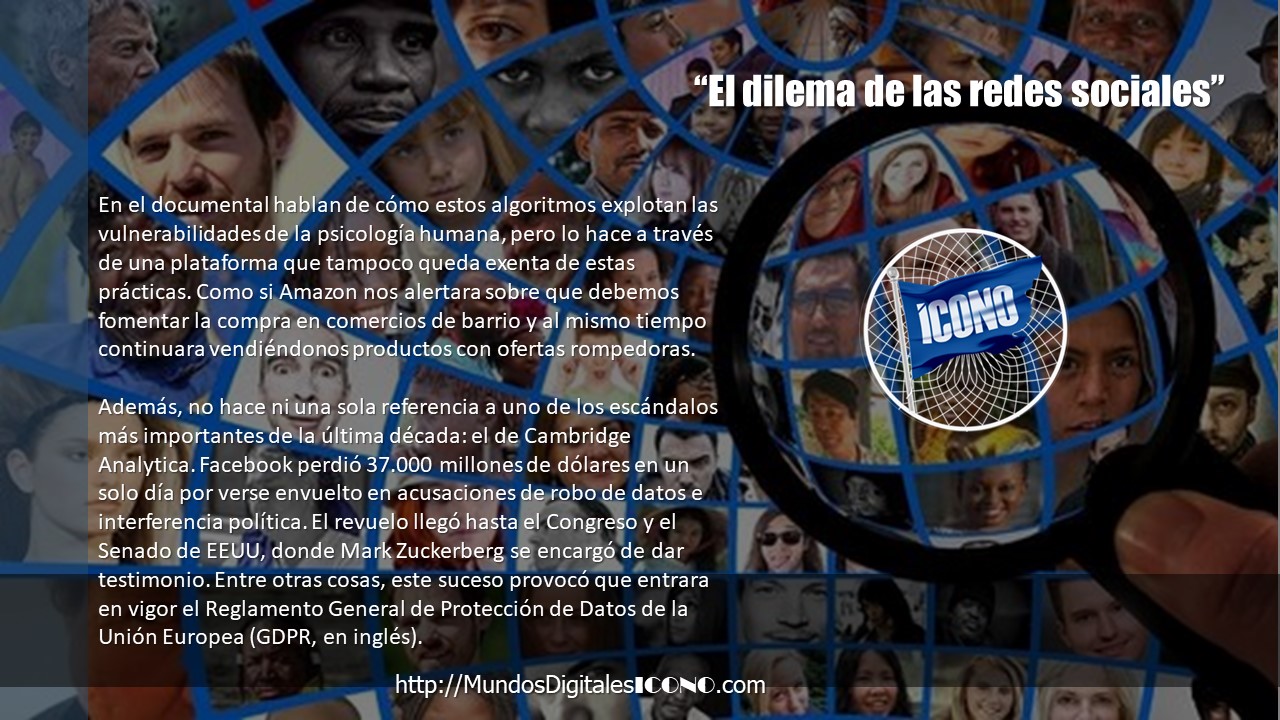 En el documental hablan de cómo estos algoritmos explotan las vulnerabilidades de la psicología humana, pero lo hace a través de una plataforma que tampoco queda exenta de estas prácticas. Como si Amazon nos alertara sobre que debemos fomentar la compra en comercios de barrio y al mismo tiempo continuara vendiéndonos productos con ofertas rompedoras.