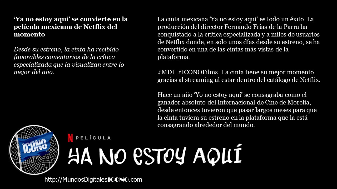 #ICONOCine#Yanoestoyaquí#CineMexicano. «Ya no estoy aquí» se convierte en la película mexicana de Netflix del momento. Desde su estreno, la cinta ha recibido favorables comentarios de la crítica especializada que la visualizan entre lo mejor del año.