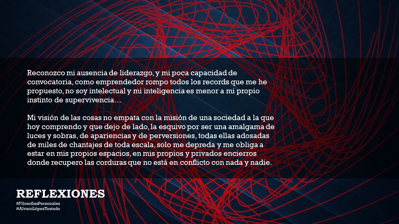 La vida y el entorno son justos conmigo y me otorgan beneficios que confortan todos y cada uno de los aspectos de mi vida…Reconozco mi ausencia de liderazgo, y mi poca capacidad de convocatoria, como emprendedor rompo todos los records que me he propuesto, no soy intelectual y mi inteligencia es menor a mi propio instinto de supervivencia…